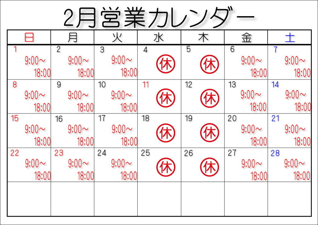 2月営業カレンダー(梅ヶ丘店)